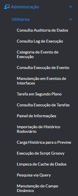Utilitários Dentro dos utilitários, temos todos estes submenus conforme mostrado na imagem abaixo: Doc navigationConsultando Auditoria de Dados →