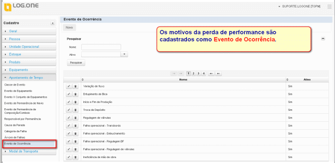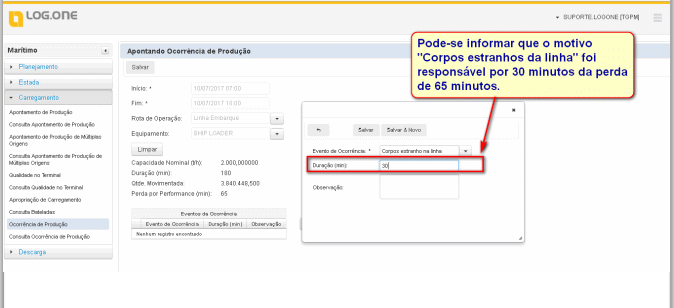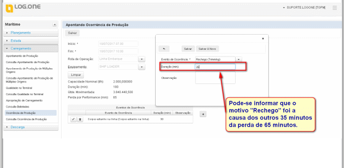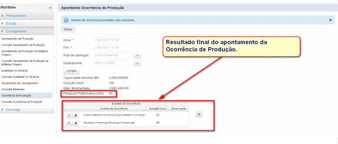 A funcionalidade de Ocorrência de Produção permite registrar os motivos de desvio quando ocorrer perda de performance durante um período de produção de embarque de navio.