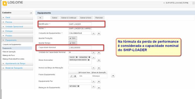 A perda por performance é equivalente ao tempo que seria necessário para produzir, no período apontado, o saldo faltante para completar o volume equivalente à capacidade nominal do equipamento de embarque (ship-loader).