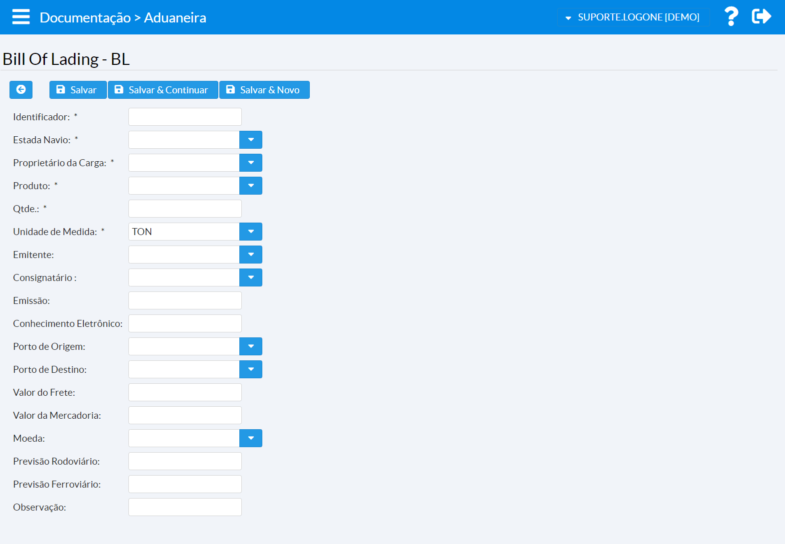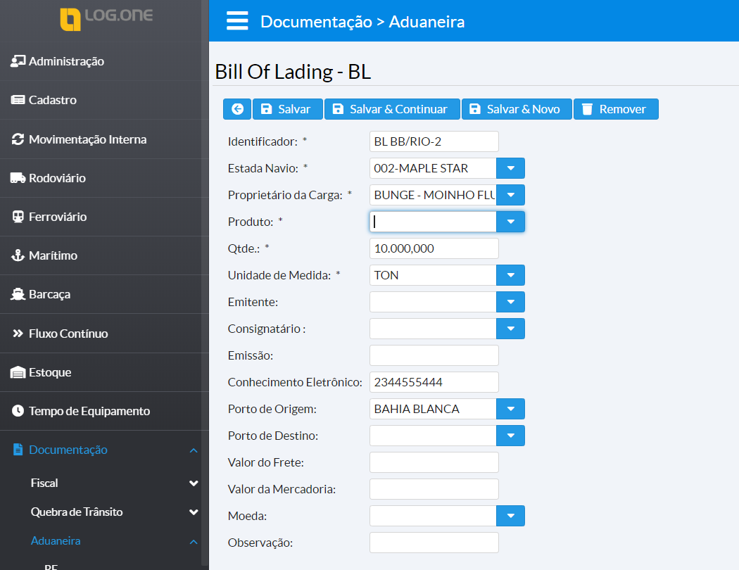 O BL deve ser criado e associado a estada de navio de importação já existente. Importante preencher o campo Conhecimento Eletrônico pois ele é exibido em algumas consultas no Previne.
