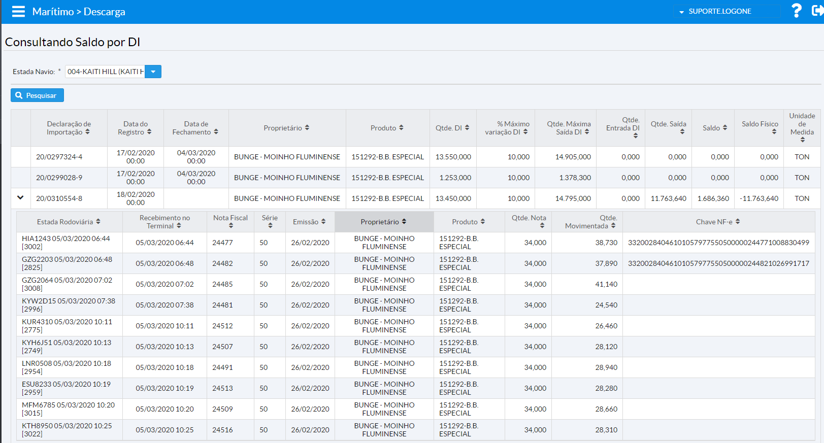 Nessa tela é possível selecionar uma estada de navio e verificar o saldo das DI’s relacionadas.