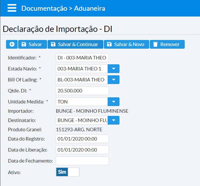Data de Fechamento = Significa que a DI está encerrada e não tem mais saldo em estoque. Ao informar uma data nesse campo a DI deixará de aparecer nas telas de associação das saídas.