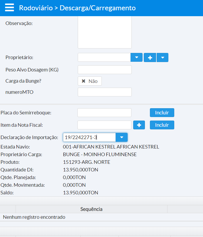 É importante sinalizar que o sistema não deixa o caminhão ser liberado caso ultrapasse o saldo da DI. Porém, existe um parâmetro(percentual.variacao.declaracao.importacao) onde se pode definir um percentual de tolerância para essa validação.