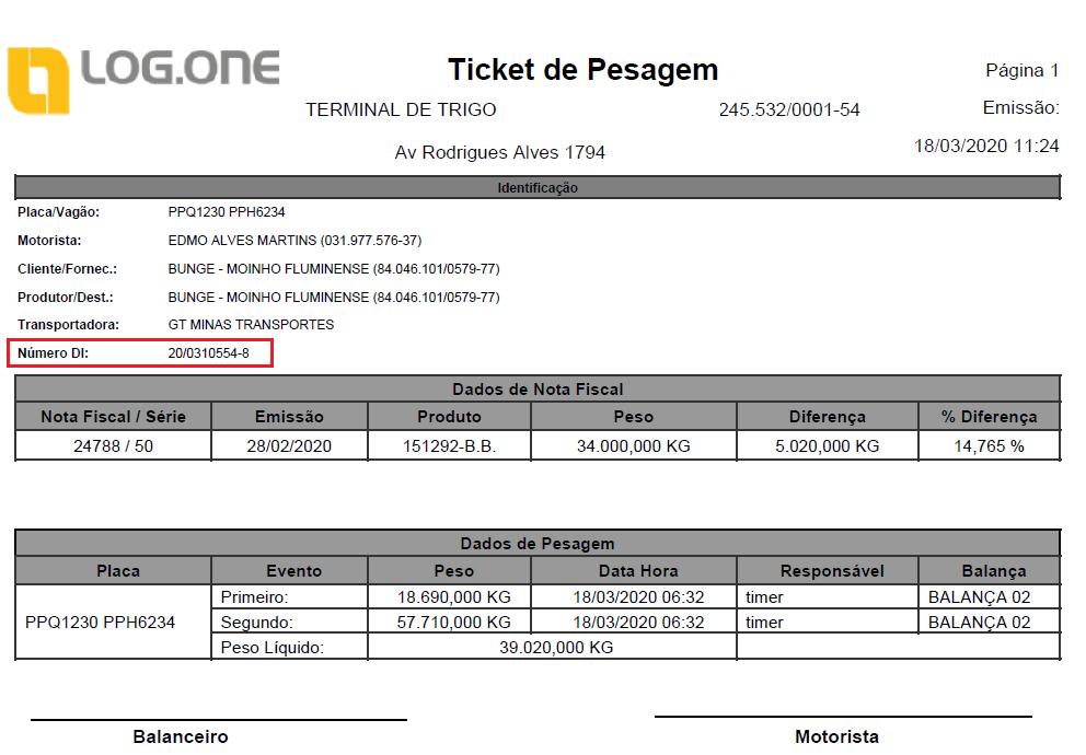 Em alguns casos é importante constar no ticket de pesagem a informação da DI para que o caminhão possa ser liberado na saída da área portuária. Tal informação é exibida no ticket: