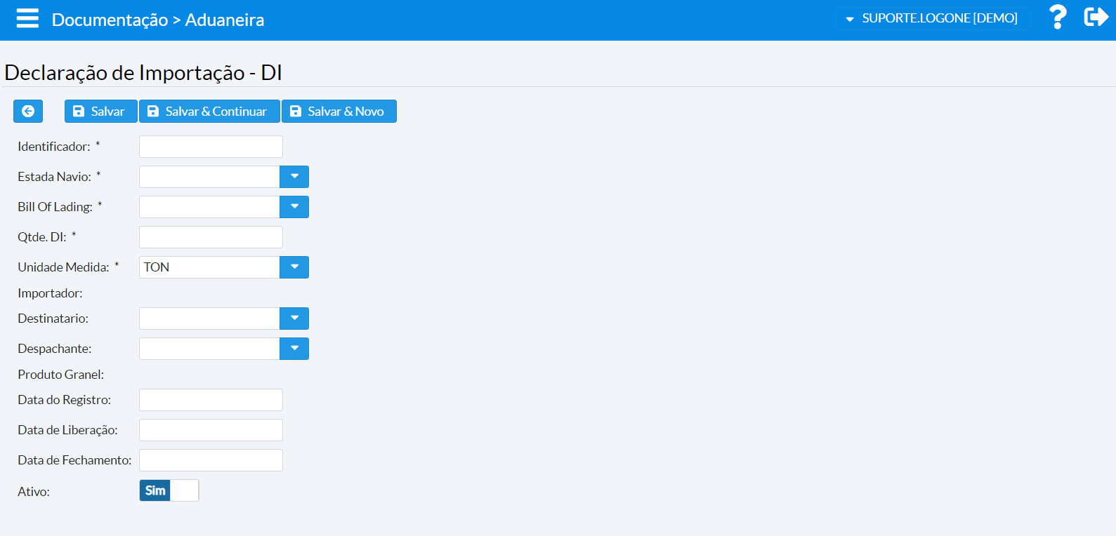 *Como esse processo é opcional no Log.One, o campo DI não é obrigatório. Porém, ele pode ser marcado como obrigatório através do Trinity. Dessa forma, pode-se obrigar sempre que um modal rodoviário tenha uma DI associada.