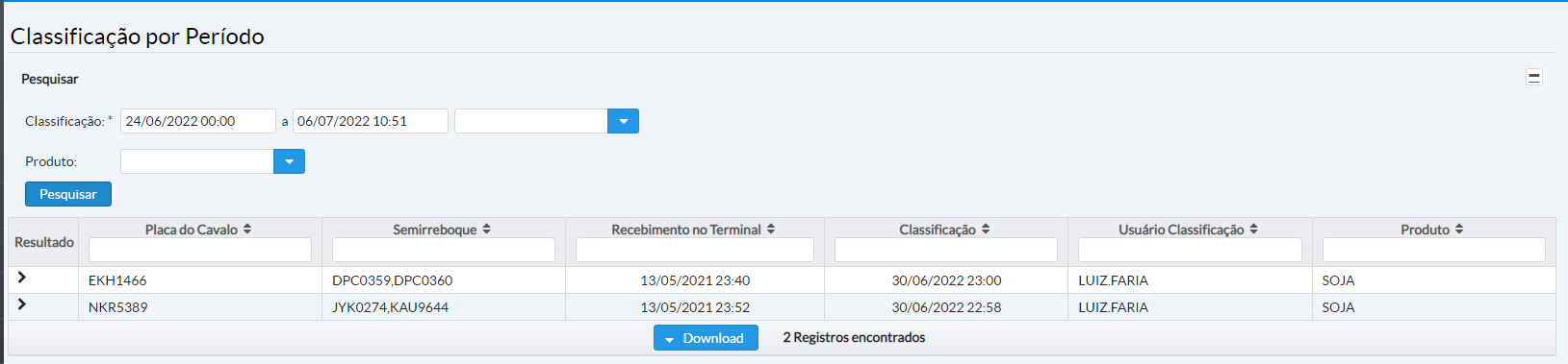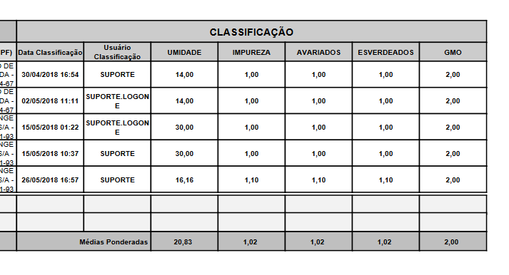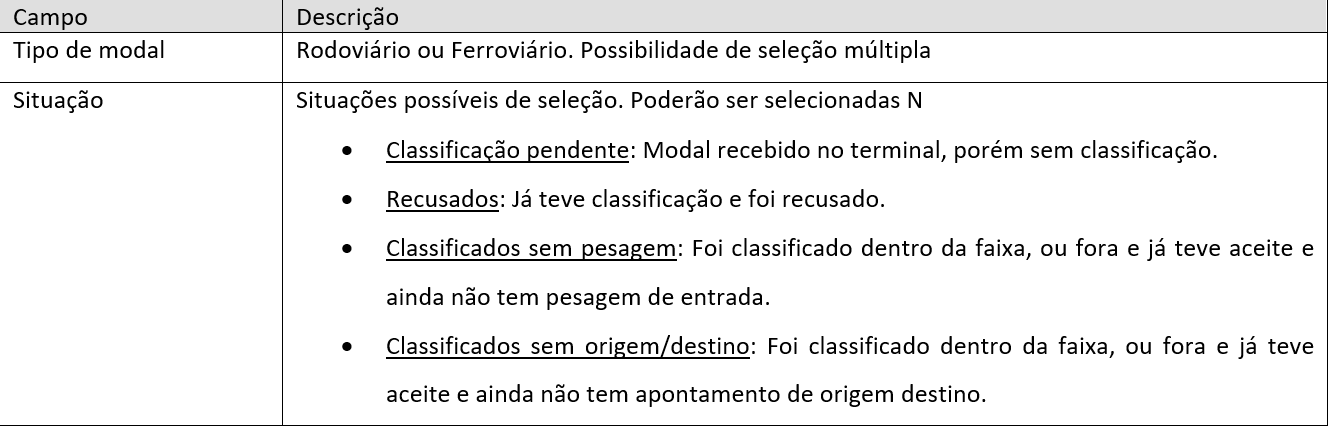 * Foram definidos filtros de “classificados” com 2 opções pois tem terminais classificam antes da pesagem de entrada, e outros após a pesagem de entrada. Caso não seja o caso do terminal, basta não selecionar a opção.