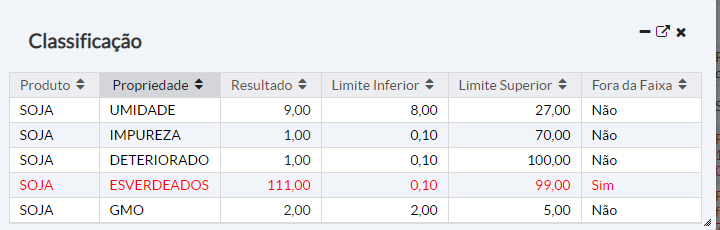 * Resultado: possui um ícone de seta onde ao clicar no mesmo será exibido os detalhes mostrando os valores da classificação para todas as propriedades.