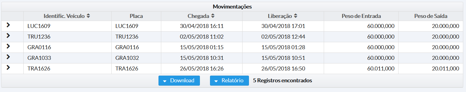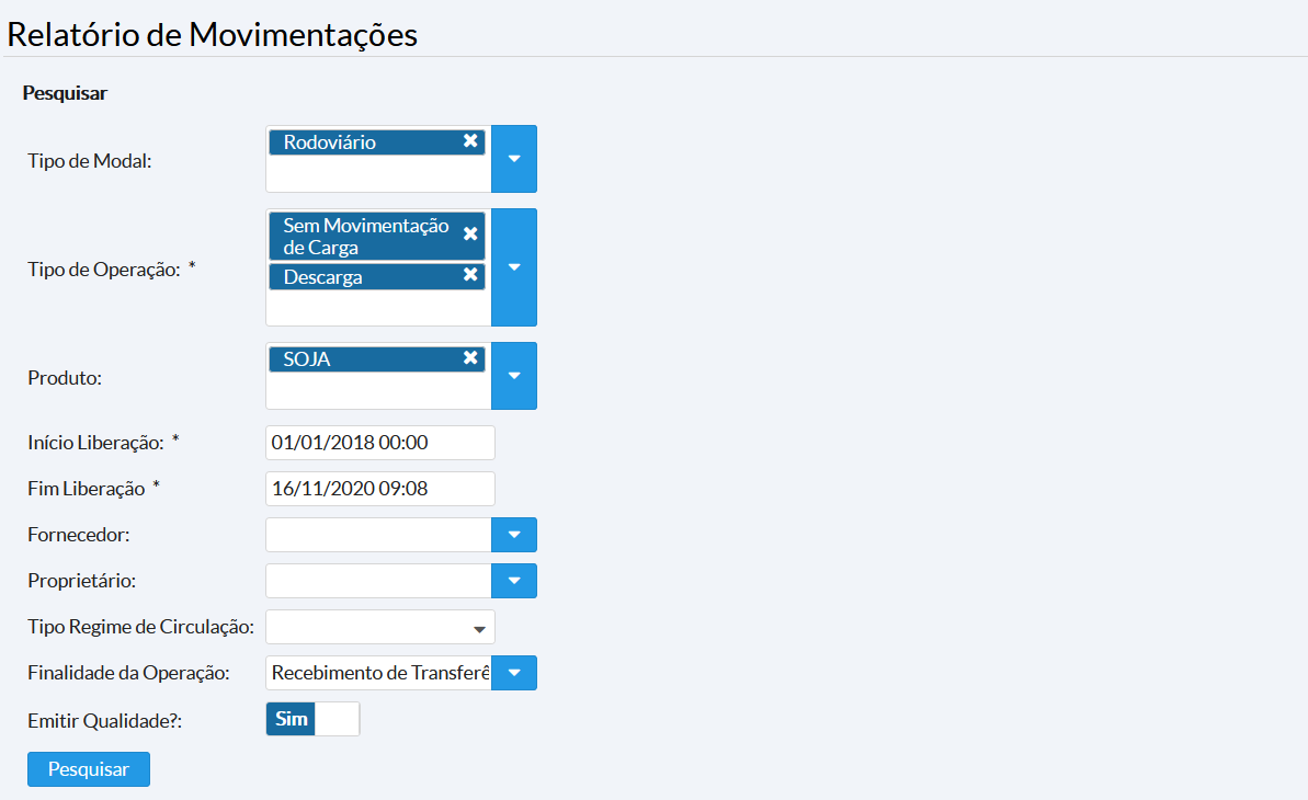 Nesta consulta é possível visualizar dados referentes as movimentações de modais. Apenas modais já liberados são exibidos.