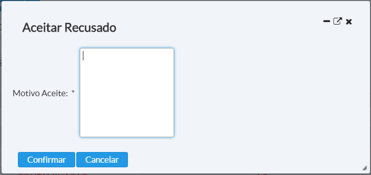 Ao clicar nesse botão será aberta uma nova tela para que o usuário possa informar o motivo da recusa e salvar.