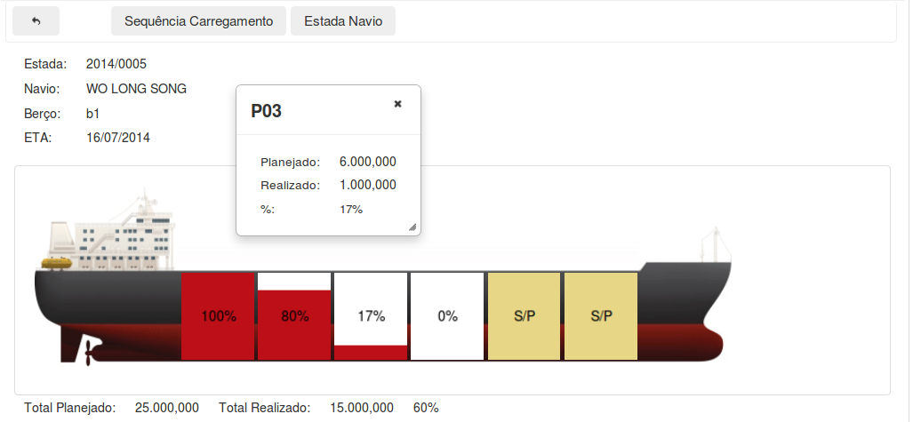 Com base nos dados planejados através do Plano de Operação e os apontamentos de produção realizados, será exibida a imagem ilustrativa do navio com o respectivo carregamento. Ao clicar nos percentuais apresentados, serão exibidas as quantidades planejada e realizada. Os porões pertencentes ao navio, mas que não tiveram planejamento também serão exibidos com a sigla S/P (Sem Planejamento).