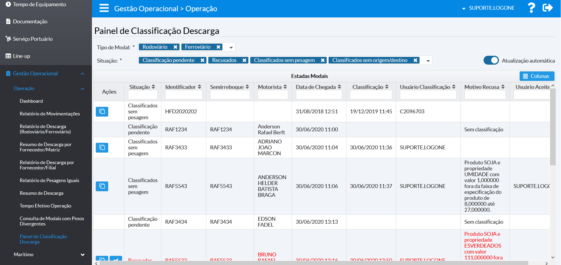 | Gestão Operacional > Marítimo > Painel de Classificação Descarga |