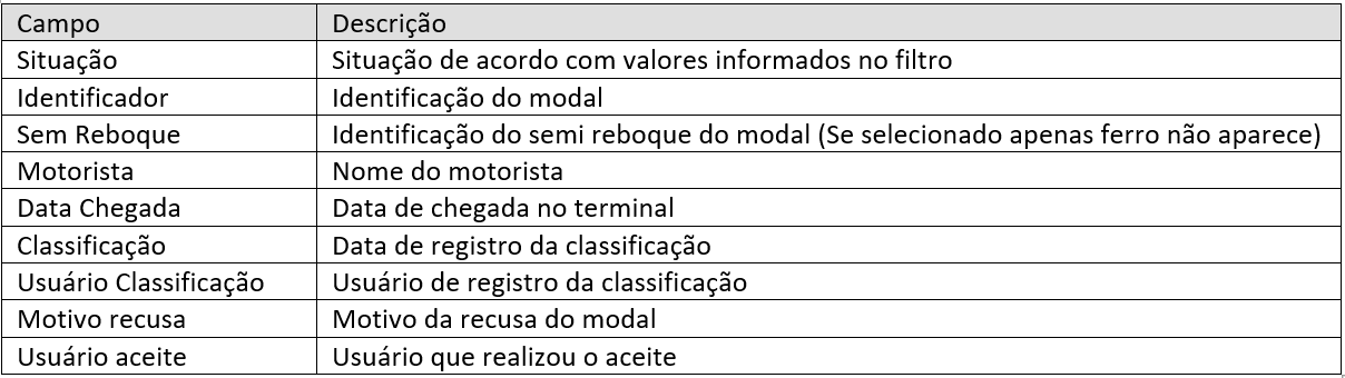 Tela onde será possível acompanhar a situação relacionada a classificação dos modais rodo e ferro que estão no terminal.