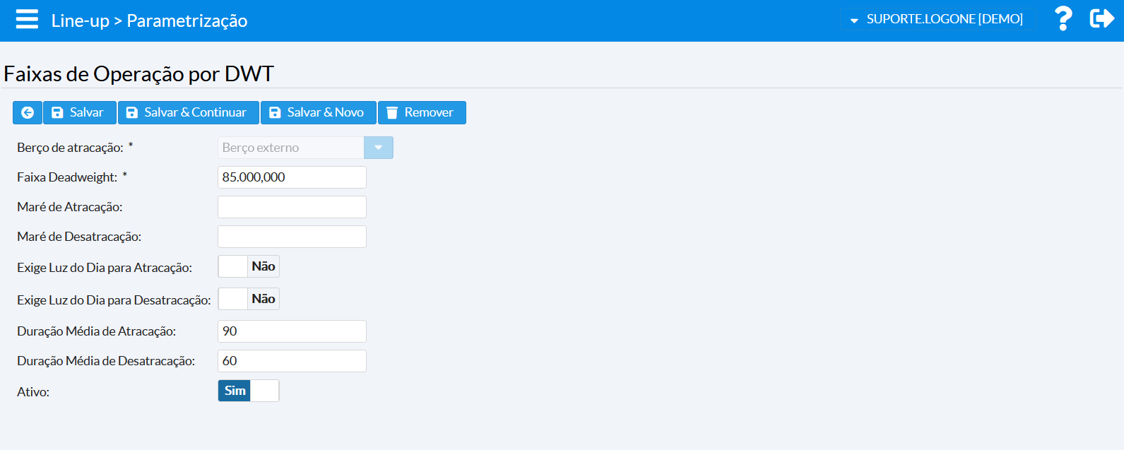 | Line-up > Parametrização > Faixa de Operação por DWT |