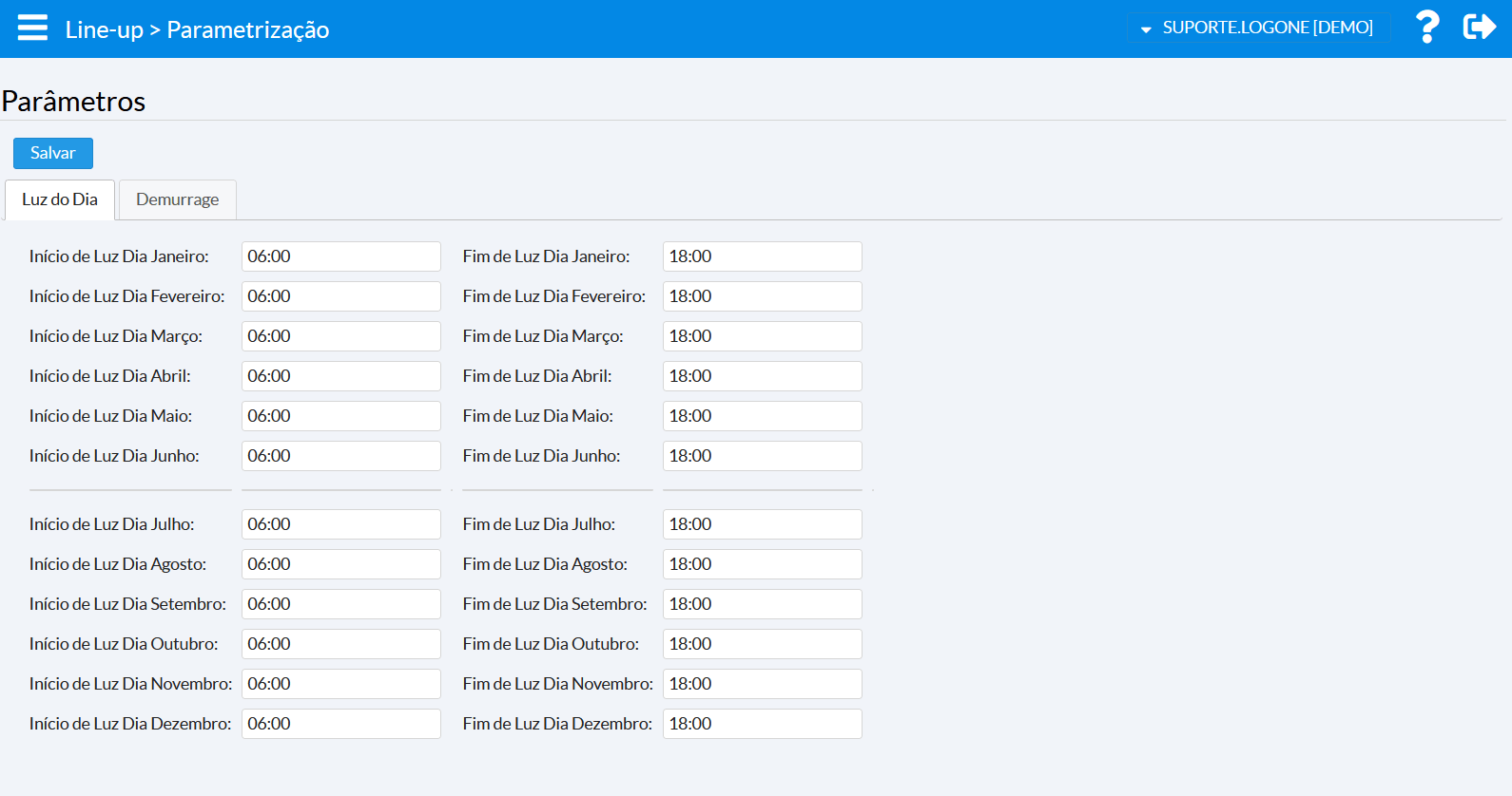 O cadastro das informações relacionadas à Luz do Dia indica os horários de início e fim em que são permitidas atracações e desacatrações de navios no porto.