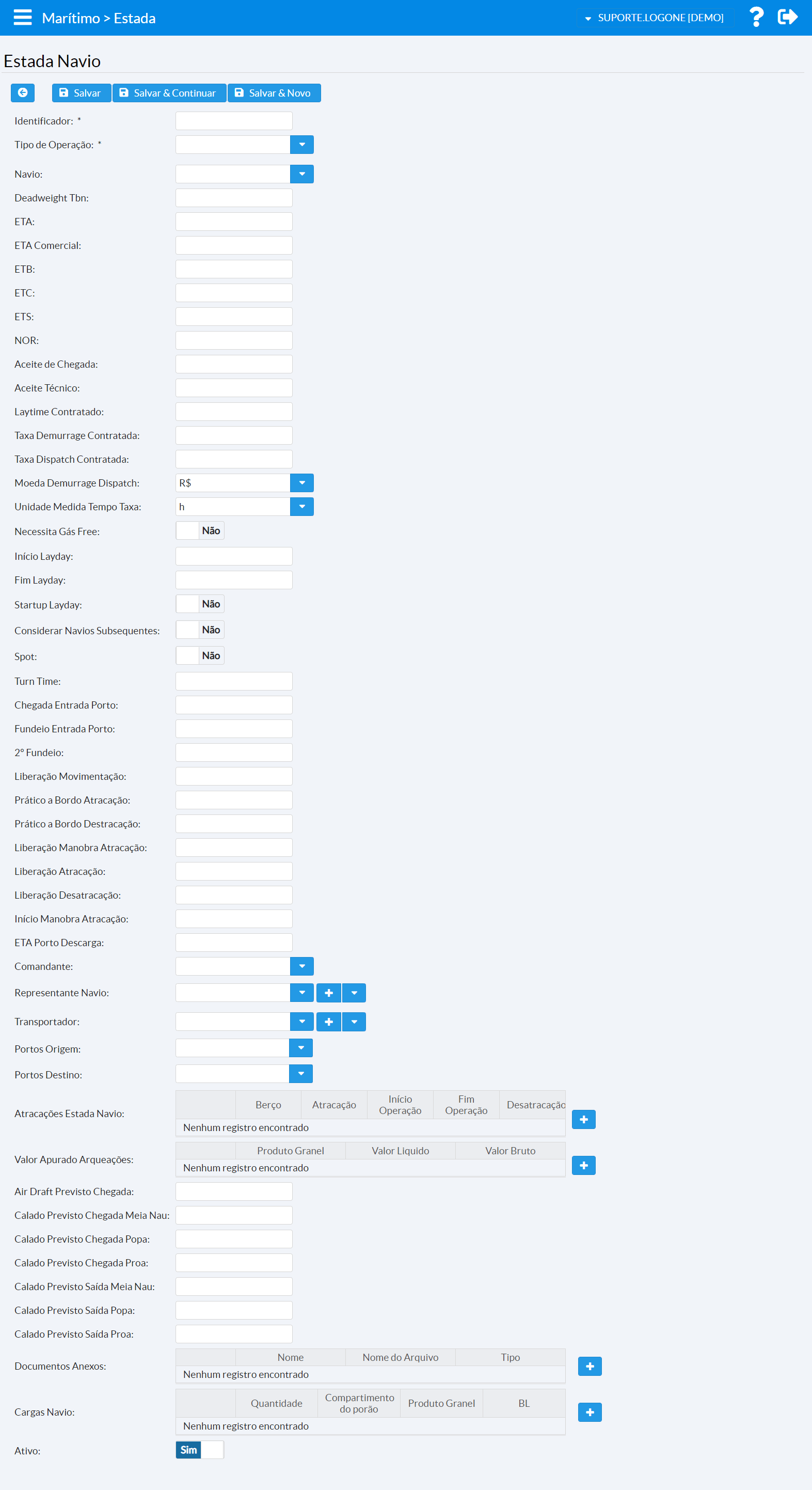 Campos como (Air Draft e campos relacionados a calado) serão obrigatórios de acordo com a parametrização inicial realizada no sistema.