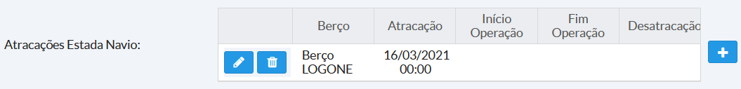 Através do botão Adicionar, registre as atracações do navio.