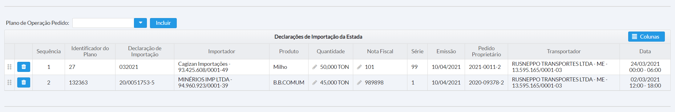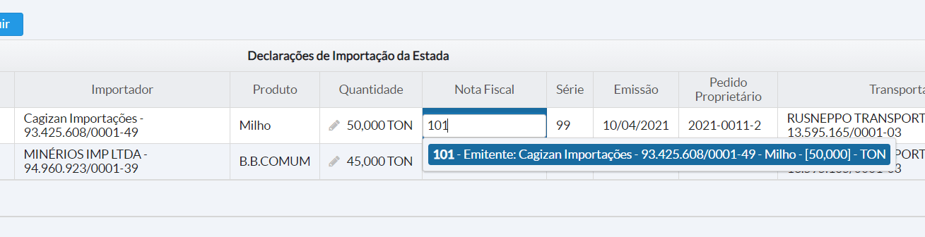 Após a seleção, é exibido na tela todas as declarações de importação da estada selecionada: