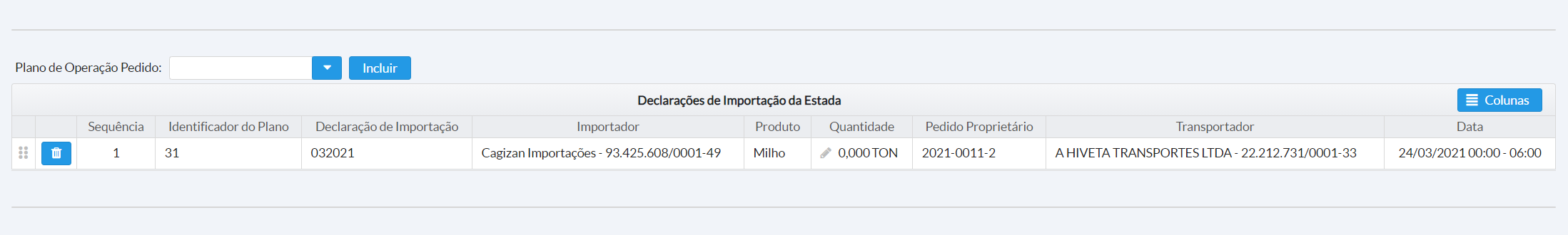 Após selecionar um Plano de Operação, clique em “Incluir” para adicioná-lo no grid.