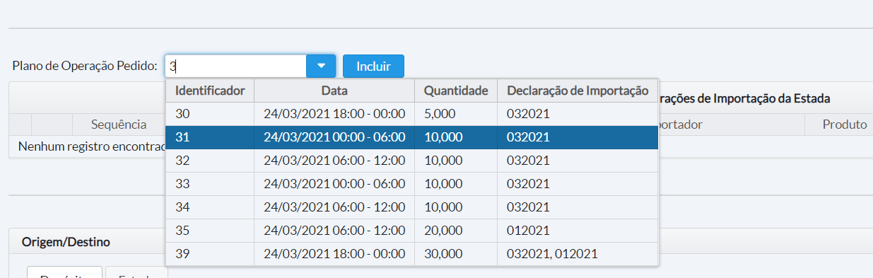 Durante o processo de recebimento, é possível associar as declarações de importação à estada, selecionando o Plano de Operação Pedido previamente cadastrados. O campo de pesquisa, ao ser preenchido, busca os planejamentos através do identificador do planejamento ou identificador da DI e são exibidos planejamentos para o transportador já selecionado no recebimento, conforme demonstrado abaixo: